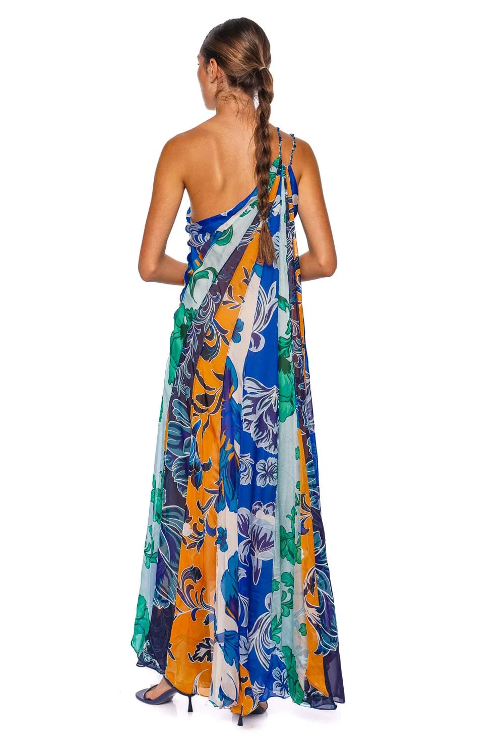 This one shoulder midi dress features beaded straps and a paneled design that flows into an asymmetric hemline.