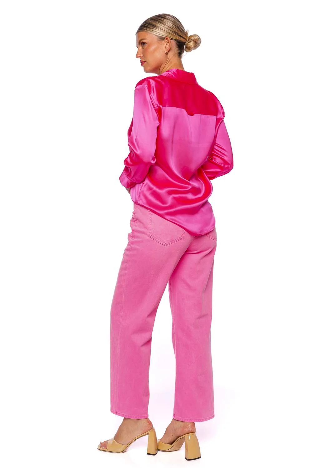 A bright pink wash brings a fresh look to nicely draped, non-stretch jeans featuring a contoured high waist and relaxed, cropped straight legs.