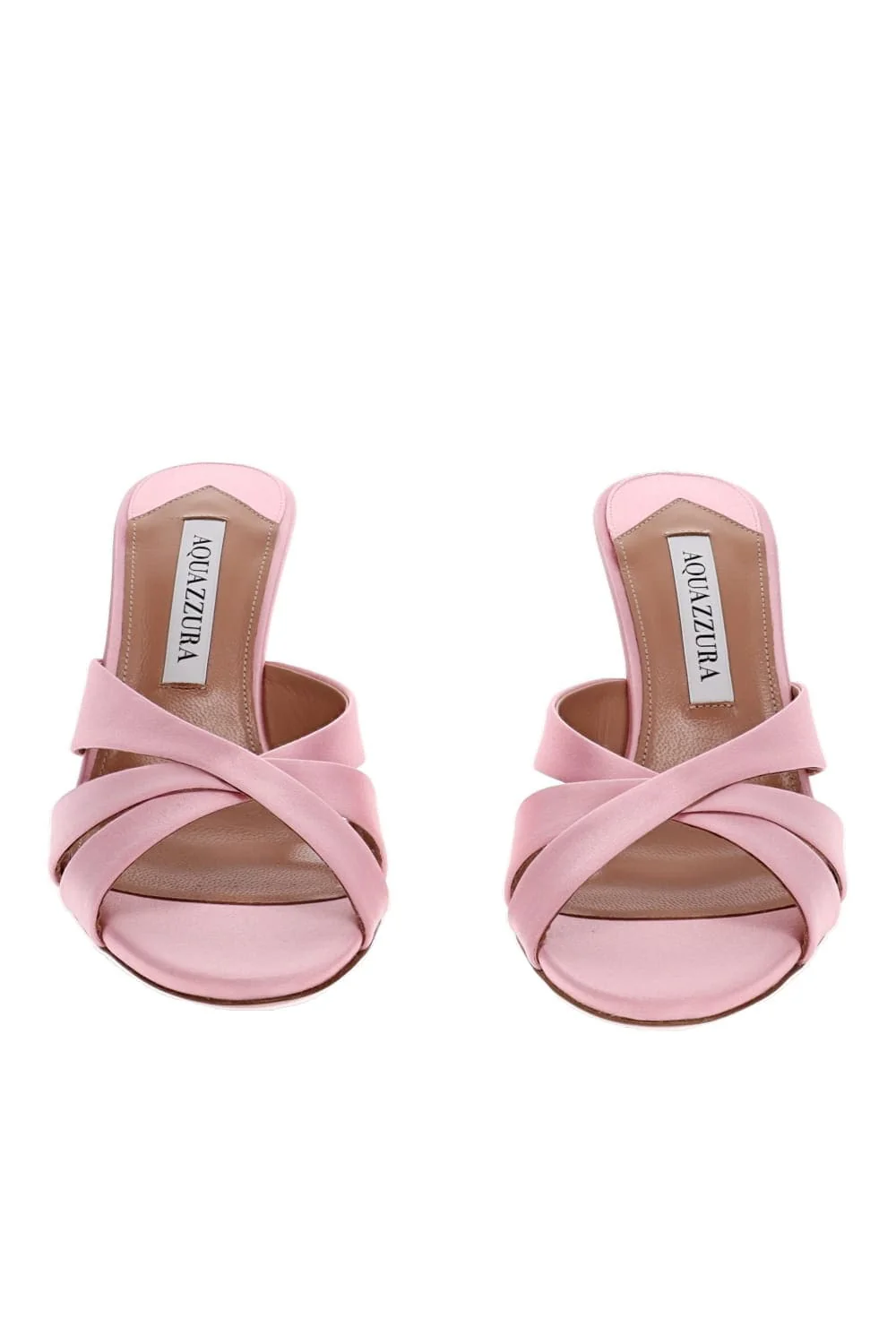 Pink satin mules featuring crystal embellishments at the base of the heel.