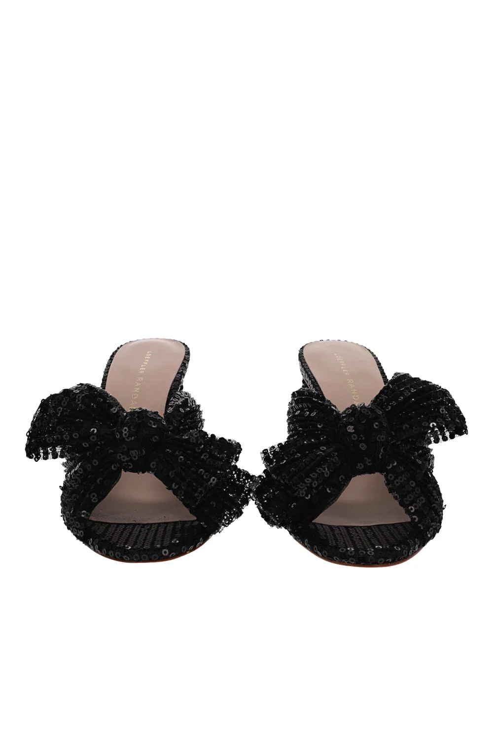 The brand’s classic pleated knot mule features the iconic knot in black with black sequins throughout. Padded footbed with gold stamped logo.