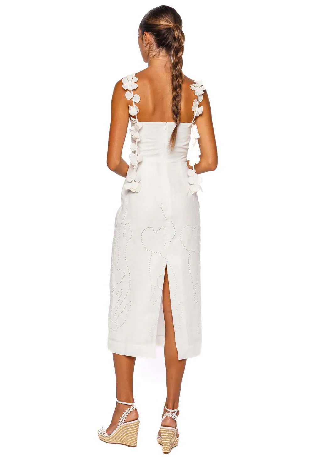 This column linen midi dress features a straight neckline framed by dainty spaghetti straps with floral applique details. Floral embroidered stitch details throughout.