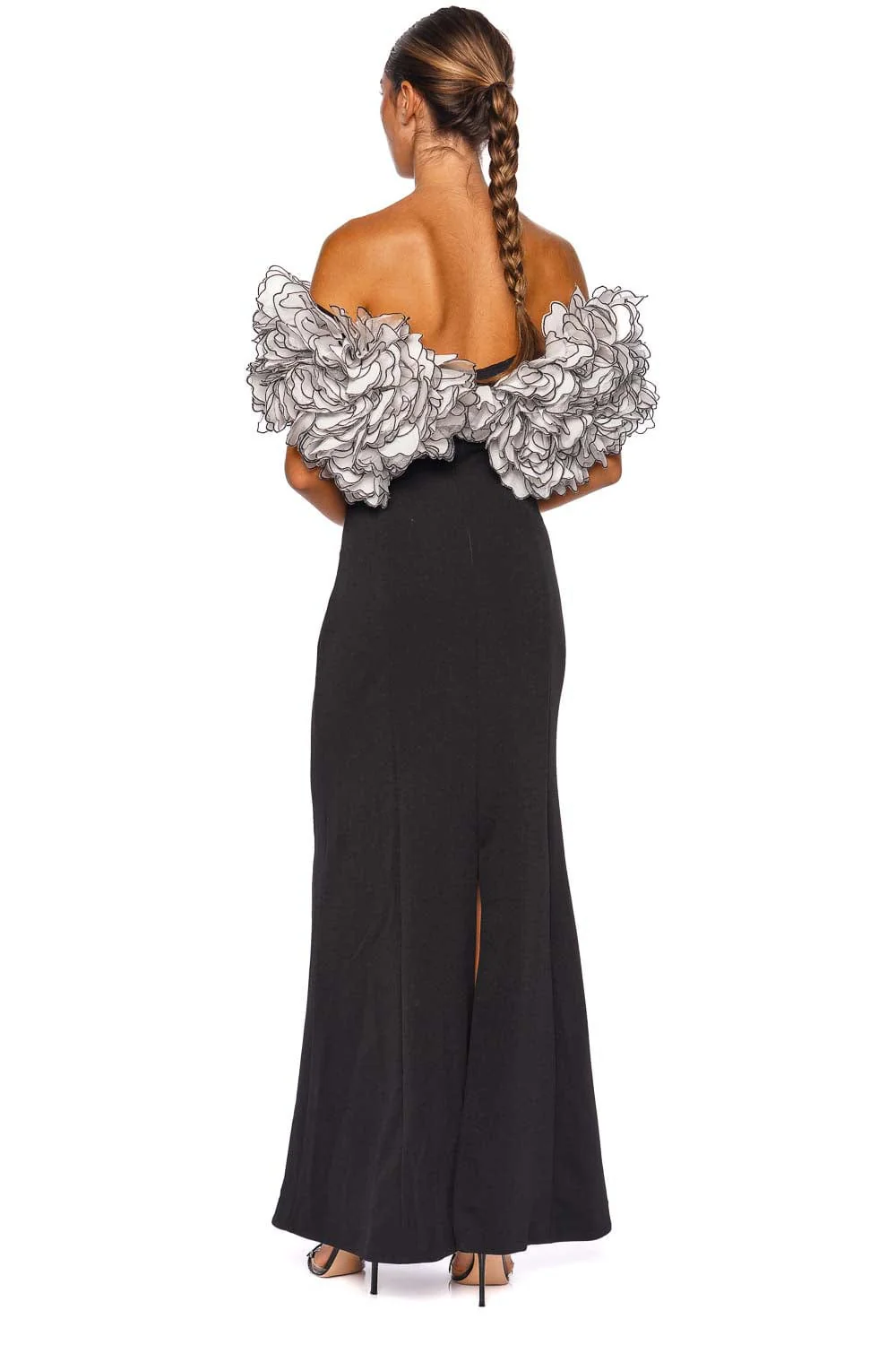 This gown features an off shoulder neckline with flutter applique details and a sleek, fitted bodice.