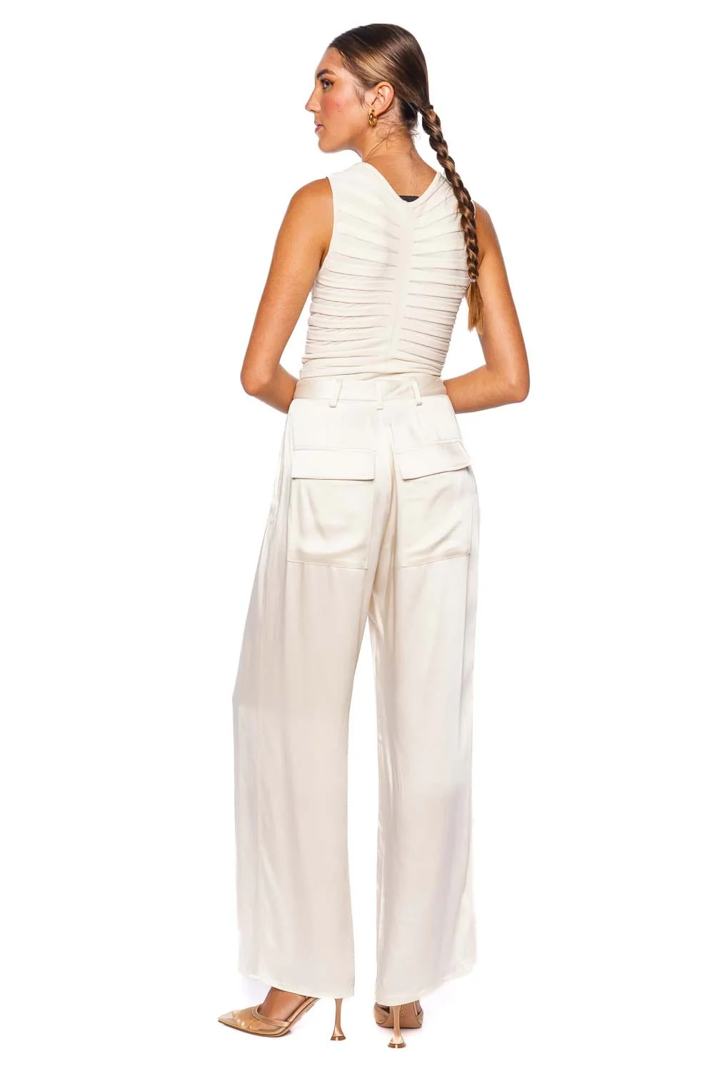 These high waisted satin pants feature a wide leg silhouette and a single front pleated detail.