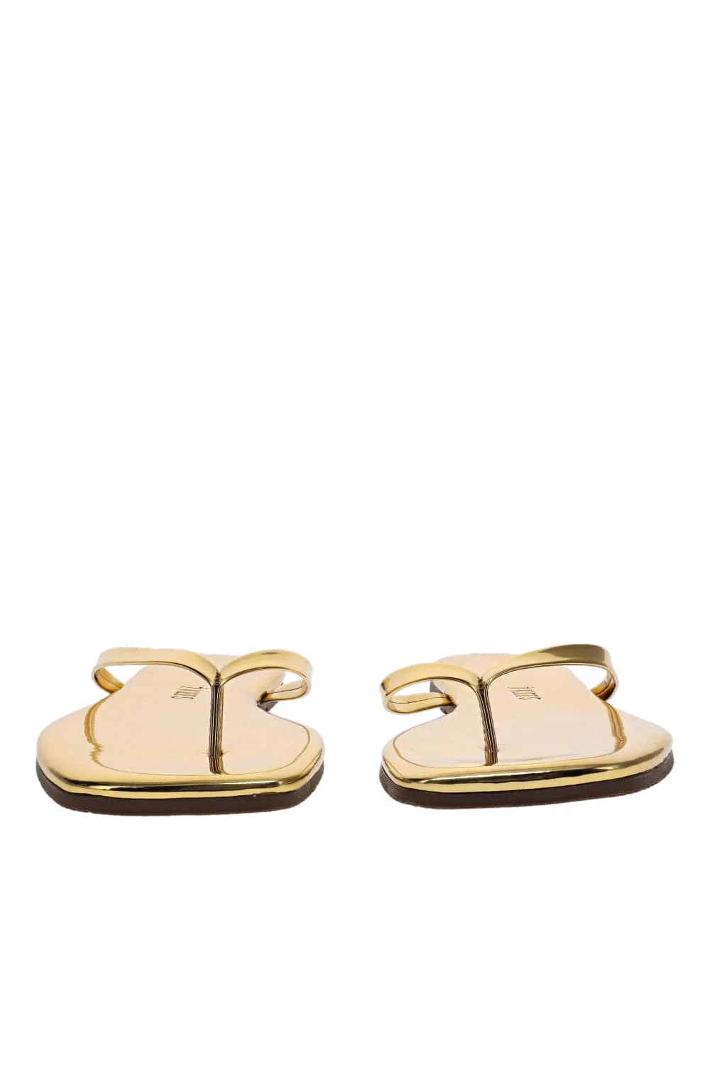 The shiny Lily sandal still embraces the classic flip flop with a synthetic leather thong strap but introduces a square toe design.