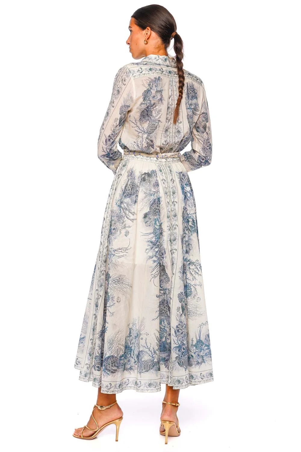 Elevate your wardrobe with this captivating maxi skirt, adorned with a striking blue toile pattern that exudes timeless elegance. The A-line silhouette offers a graceful flow, perfect for any sophisticated outing. Pair it with a crisp blouse and heels for a chic complete look or a casual t-shirt for a whimsical day out.