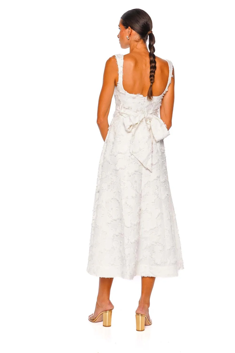 Embrace effortless elegance with the Zinnia Feathered Jacquard White Midi Dress. This dress features a luxurious jacquard fabric with a delicate feathered texture, offering a sophisticated, tactile experience. The wide straps complement the elegant silhouette, making it a perfect choice for both intimate gatherings and grand occasions. Pair with minimalistic heels and understated jewelry to let the dress take center stage.
